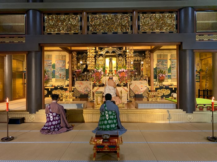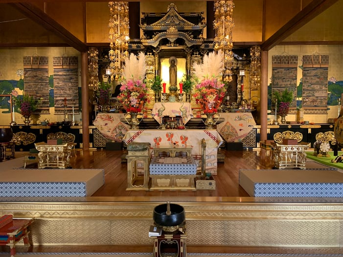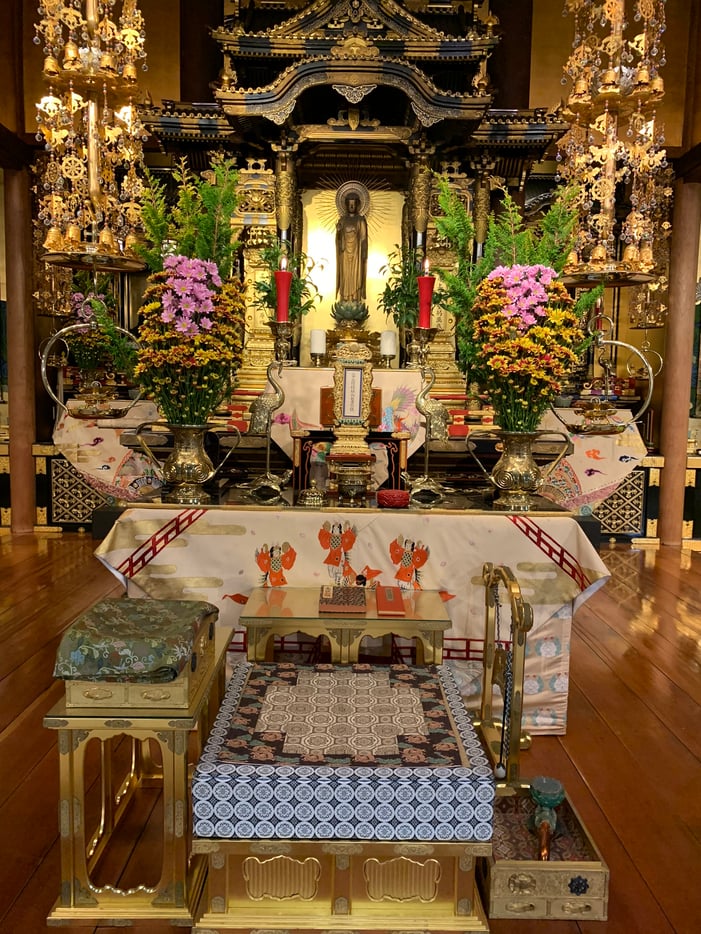 今月24日には、報恩講のお勤めがご本堂にて勤まりました。コロナウイルス感染症のリバウンドが懸念される中、住職及び参勤僧侶のみにての山内勤めという形式です。当日は秋晴れで気温も上がり、もしお檀家さんのご参詣があればさぞかしいい日和であったと思われました。