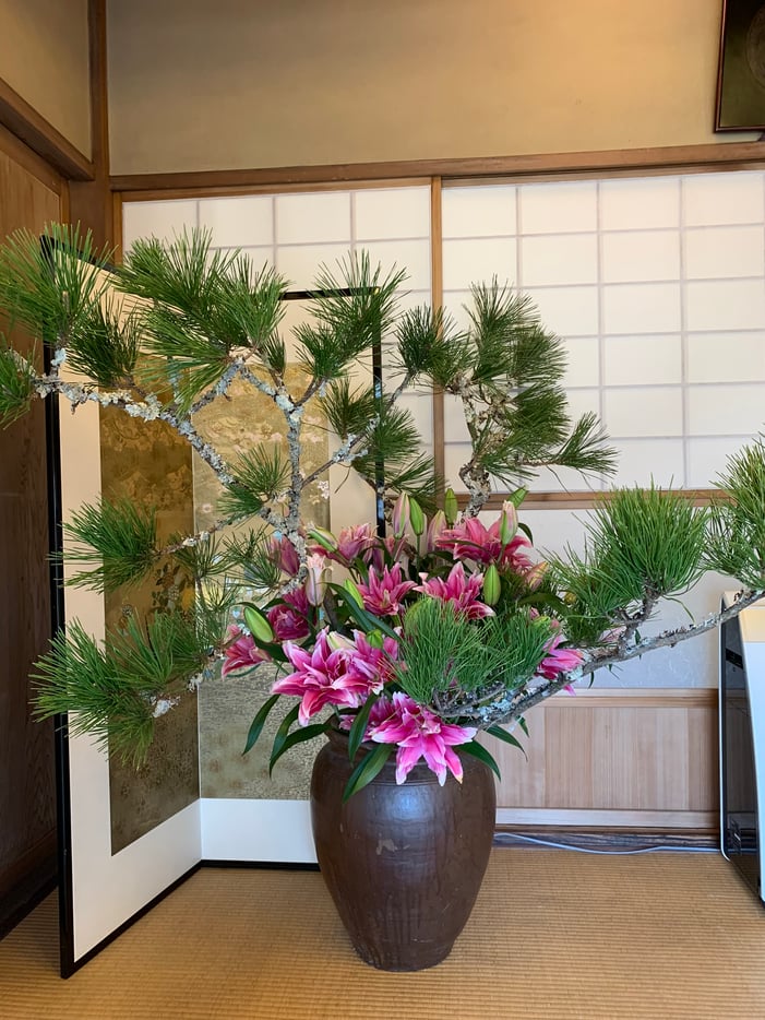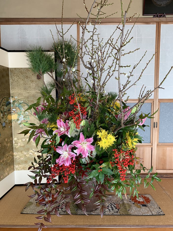 毎年恒例の玄関の投げ入れですが、花入れの壺の後ろに空気清浄機のコードが映り込んでしまいました。しかしこれもまたwithコロナの時代の記録として、、、。